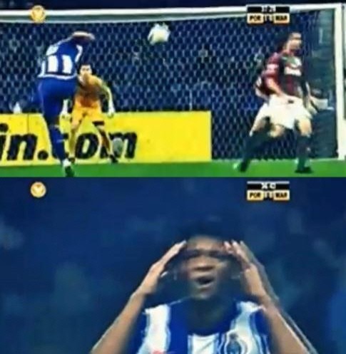 구아린은 골을 넣은 후 양손으로 이마를 잡고 본인도 믿기지 않는 듯 깜짝 놀란 표정을 짓고 있다.