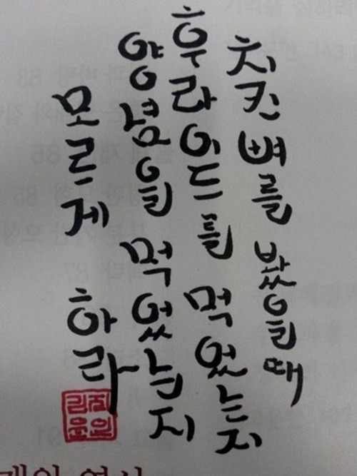 공개된 사진에는 한지 위에 붓글씨로 쓰여진 치킨에 관한 명언이 담겨 있다. 해당 내용을 보면 “치킨 뼈를 봤을 때 후라이드를 먹었는지 양념을 먹었는지 모르게 하라”는 것. 이는 뼈에 붙은 살점이 없도록 깨끗하게 발라먹으라는 뜻으로 해석된다.