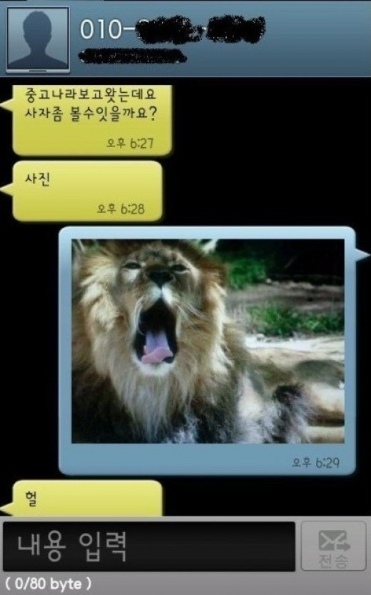 이에 판매자는 입을 크게 벌린 사자 사진을 보내 구매자를 놀라게 했다. 이는 구매자가 [사진]을 [사자]라고 오타를 내 잘못 보냈고, 판매자는 장난기가 발동해 진짜 사자 사진을 보낸 것이다.