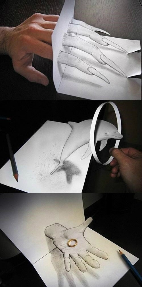 공개된 사진에는 착시 효과를 일으키는 다양한 그림들이 담겨 있다. 자세히 보면 이 작품들은 모두 종이를 이용해 연필로 그린 것이다.