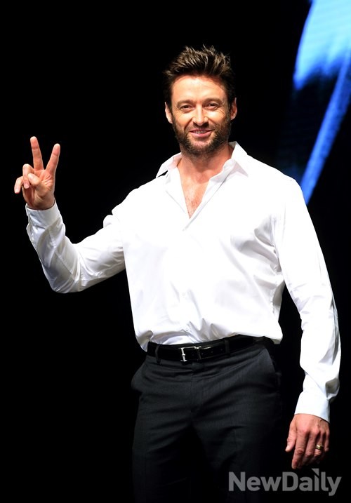 기자회견장에 등장한 휴잭맨이 브이를 그리는 깜찍한 포즈를 취해 취재진의 웃음을 자아냈다.