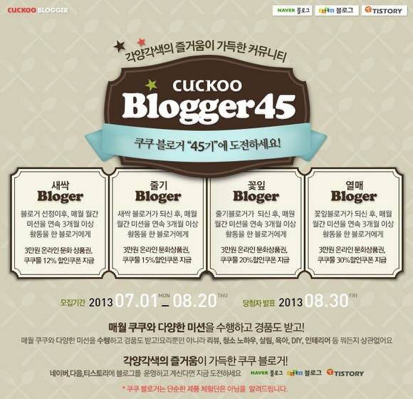 생활가전기업 <쿠쿠전자>(대표 구본학)는내달 20일까지 미션을 수행하고다양한 혜택을 누릴 수 있는[쿠쿠 블로거 45기]를 모집한다.쿠쿠 블로거는 쿠쿠 전기밥솥을 활용한 요리 레시피 소개,쿠쿠 제품리뷰 등의 다양한 활동을 펼치게 되며,매월 우수한 활동을 한 블로거는경품 증정 등의 다양한 혜택을 누릴 수 있다.요리 및 육아, DIY, 인테리어 등의 분야에 관심이 많고다음, 네이버, 티스토리 등에서 블로그를 운영한다면누구나 신청할 수 있다.참가 신청은 쿠쿠 홈페이지에 있는 양식에 따라본인이 운영하고 있는 블로그에 대한 소개와관심 있는 주제를 작성해 제출하면 된다.쿠쿠 블로거로 선정되면매 월 요리 미션과 리뷰블로거 선정 미션을수행하게 된다.7월에는 월간 요리 미션으로[밥솥으로 신혼의 재미 야식 만들기편]을 진행하고 있으며,우수 블로거를 선정해 쿠쿠 전기밥솥 등제품 증정, 경품 지급 등의 풍성한 혜택을 제공한다.,쿠쿠 블로거는 1년간 활동하며,3개월 이상 활동을 한 블로거에게는소정의 상품권 및 쿠쿠몰 할인권이활동기간에 따라 지급된다.또 쿠쿠 홈페이지 내 쿠쿠 블로거를 위한별도의 커뮤니티를 운영,살림에 관한 유용한 정보와 함께다양한 이벤트를 진행해 블로거 뿐 아니라일반소비자들에게도 다양한 혜택을 선사한다.쿠쿠 블로거 45기 신청은쿠쿠 홈페이지에서 가능하며,발표는 8월 30일 쿠쿠 홈페이지 및개인 메일를 통해 공지된다.