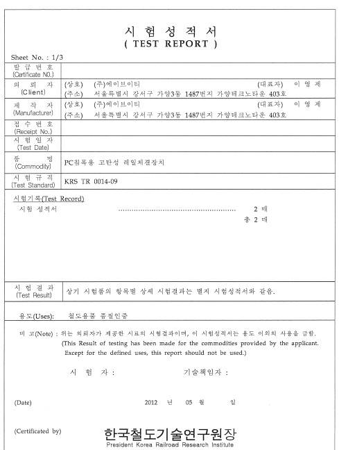 문서를 위조한 후, <철도시설공단>에 제출했다.▲ AVT가 철도시설공단에 제출한 위조된 시험성적서