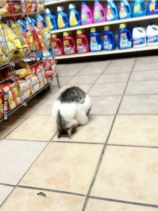 공개된 사진에는 마트 세제 한쪽에서 자리를 잡고 있는 고양이의 모습이 담겨 있다. 특히, 고양이는 카트가 지나갈 수 없도록 복도에서 몸을 동그랗게 말고 꿈쩍하지 않고 있어 눈길을 끈다.
