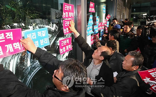 금융감독원에 또 적발된 것이다.국내 금융사 중계열사 간 대규모 부당 대출이 일어난 것은사실상 이번이 처음이다.▲ (서울=연합뉴스) 2008년12월 서울 서대문 농협중앙회 앞에서 열린 '농협비리척결' 운동의 한장면