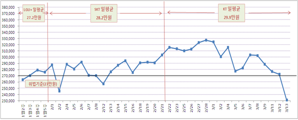 [KT] 32만 6,000원, [SKT] 29만 7,000원, [LGU+] 27만 8,000원을 기록했다.<3월 14일 제재조치 이후 단말기 보조금 추이>