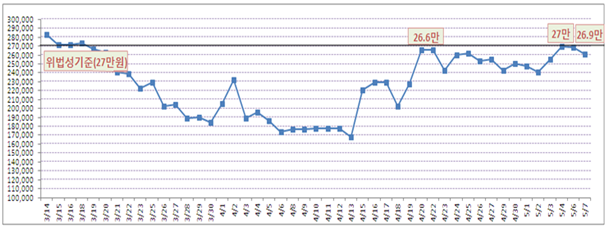 보조금 지급 위법성 판단기준인 27만원을 초과한 비율은 71.9%로