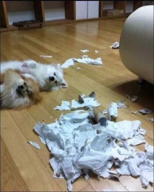 공개된 사진에는 마룻바닥 위에 갈기갈기 찢어진 휴지 조각이 지저분하게 흩어져 있다. 그 옆에는 강아지 두 마리가 눈을 꼭 감고 누워 있으며, 마치 자신들은 전혀 모르는 일인양 시치미를 떼고 능청스럽게 연기하는 것처럼 보인다.