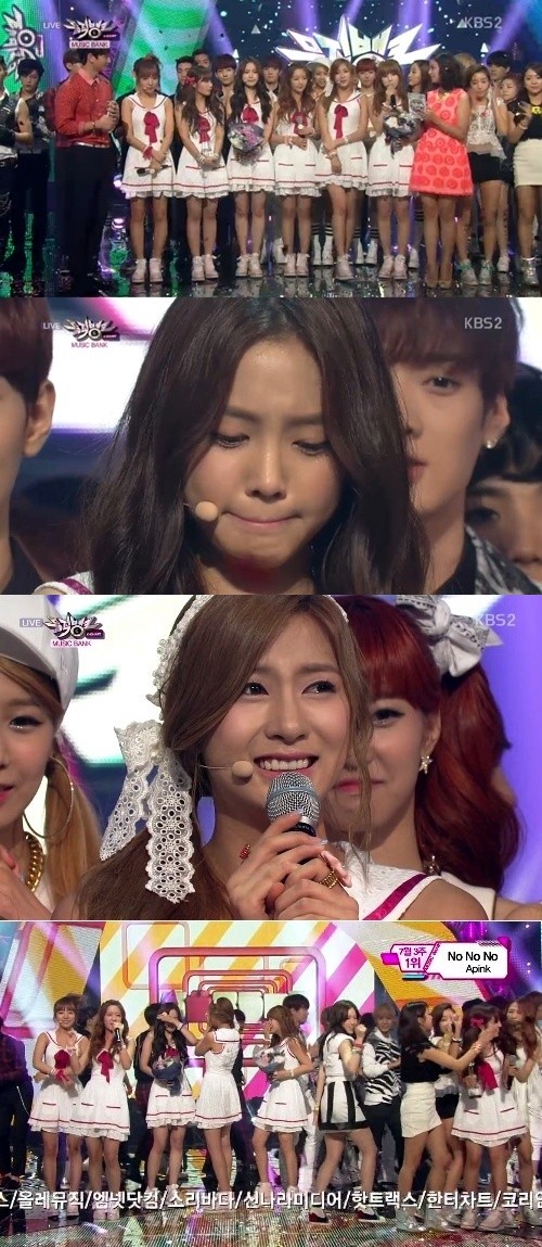걸그룹 에이핑크(박초롱, 윤보미, 정은지, 손나은, 김남주, 오하영)가 데뷔 2년 만에 지상파 음악프로그램 첫 1위에 눈물을 흘렸다.
