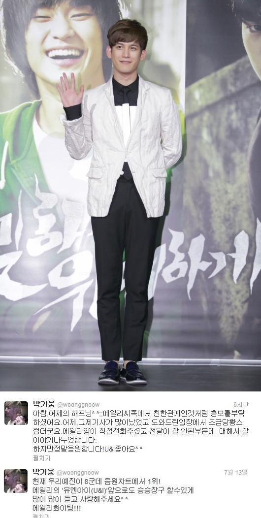 앞서 박기웅은 지난 13일 자신의 트위터에 “현재 우리 예진이 8군데 음원차트에서 1위! 에일리의 '유엔아이(U&I)' 앞으로도 승승장구 할 수 있게 많이 듣고 사랑해주세요^^ 에일리 화이팅!!!”이라는 글을 남겨 열애설 의혹을 받았다.