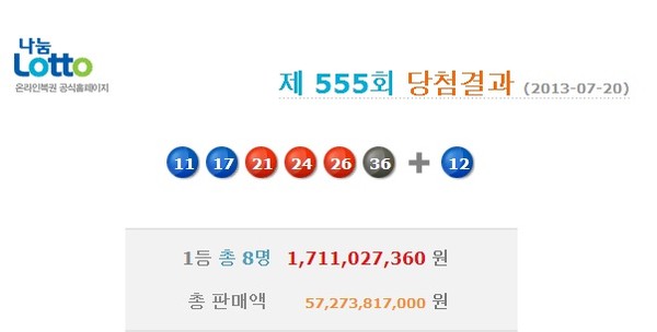2013년 7월 20일 실시된 제555회 나눔로또 1등 당첨번호는 ‘11, 17, 21, 24, 26, 36’이며, 2등 보너스 번호는 12번이다.