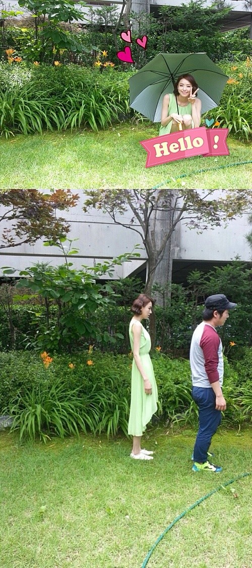 공개된 사진은 SBS 수목드라마 <너의 목소리가 들려> 촬영장에서 찍은 것으로 보인다. 사진 속 이다희는 연두색 민소매 원피스를 입은 채 우산을 쓰고 풀밭 위에 쪼그려 앉아 손가락으로 브이(V)자를 그리고 있다.
