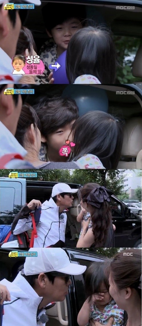 이날 성동일은 아들 성준과 갯벌 여행을 떠나기 전 아내와 막내딸 성율의 배웅을 받았다. 성율은 잘 다녀오라는 의미로 오빠인 성준에게 애교 섞인 뽀뽀를 해줬다.