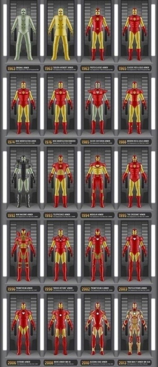 시대별 아이언맨 슈트가 공개됐다.최근 한 온라인 커뮤니티 게시판에는 [시대별 아이언맨 슈트]라는 제목으로 사진 한 장이 올라와 관심을 모았다.