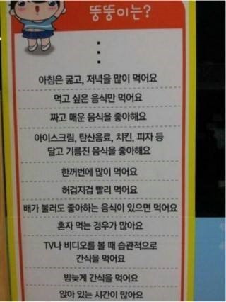이는 아이들의 비만 자가 진단표이다. 사진 속에는 “뚱뚱이는?”이라는 질문과 함께 살찌는 사람의 특징이 구체적으로 나열돼 있다.