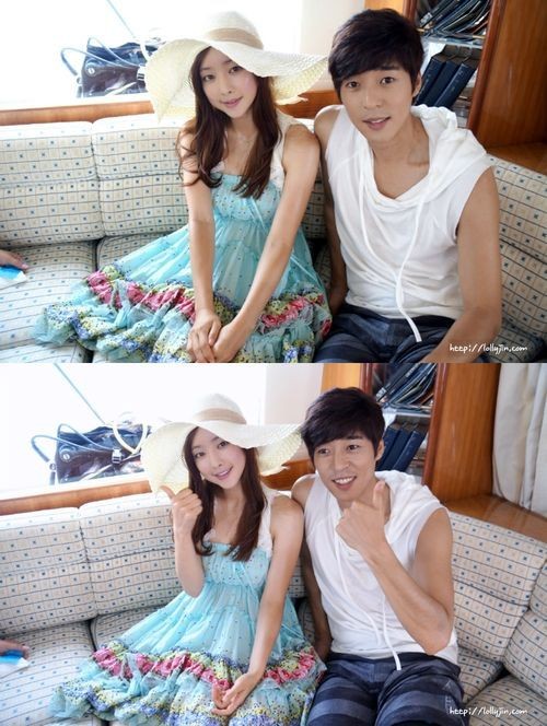 홍수아는 하늘색 비치웨어에 밀집모자로 청순하고도 소녀 같은 매력을 뽐내고 있으며, 서지석은 흰색 티셔츠를 입은 채 밝은 미소로 브이를 하고 있는 모습이다.