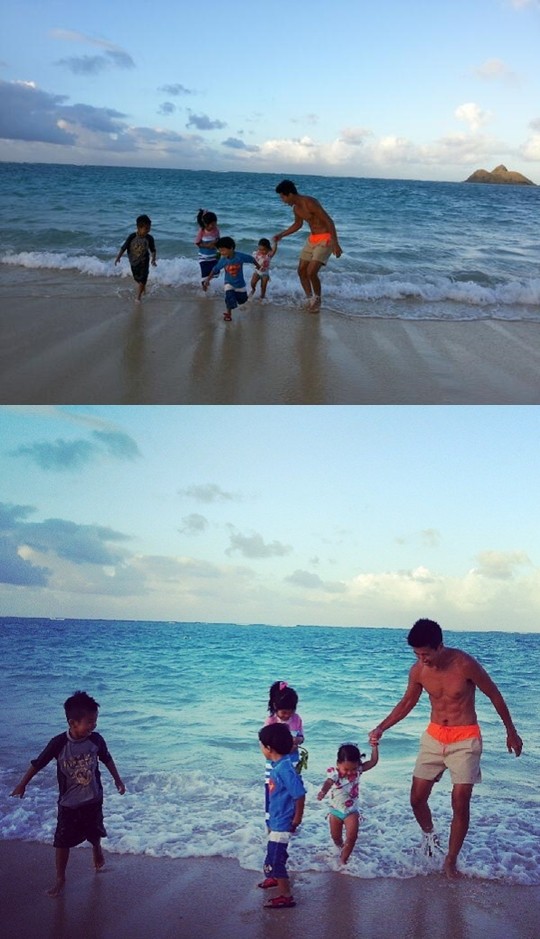 공개된 사진 속 션은 네 명의 아이들과 함께 하와이 바닷가에 뛰놀고 있다. 특히, 막내 딸 하엘의 손을 잡고 해맑은 미소를 짓고 있는 아빠 션과 행복한 아이들의 모습에서 훈훈한 가족애가 물씬 느껴진다.