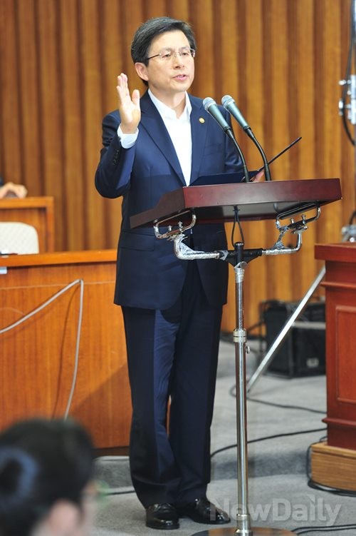 국정조사특별위원회에 출석한 <황교안> 법무부 장관이 증인 선서를 하고 있다.