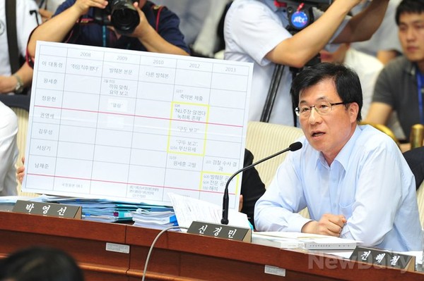 24일 여의도 국회 국가정보원 댓글 의혹 사건진상규명을 위한국정조사특별위원회에서 민주당 <신경민> 의원이 국정원 사건 개요도를 보이며 질문하고 있다.