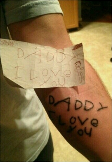 공개된 사진에는 한 남성의 팔에 팔에 문신을 한 모습이 담겨 있다. 특히, 삐뚤빼뚤하게 서툰 글씨체로 써진 [DADDY I LOVE YOU](아빠 사랑해요)라는 문구가 눈길을 끈다. 이는 자신의 아이가 처음으로 쓴 글씨를 몸에 새긴 것으로 알려져 훈훈함을 자아냈다.