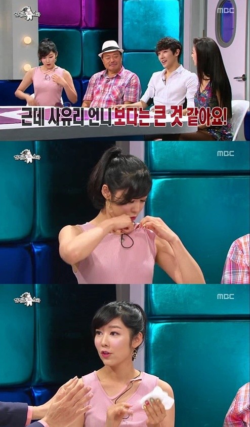 사유리는 “클라라 가슴이 크다는 얘기를 들어서 대기실에서 넣었다”면서 “어제부터 잠을 못 잤다. 비교될까봐 신경 쓰였다. 근데 실제로 보니 빼도 될 것 같다”고 밝혀 스튜디오를 초토화시켰다.