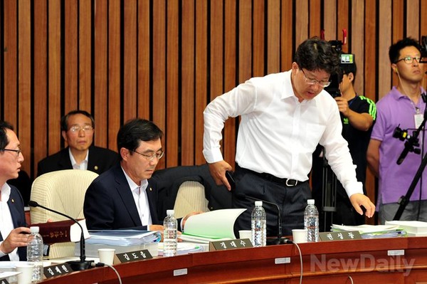 25일 여의도 국회 국가정보원 댓글 의혹 사건진상규명을 위한 국정조사특별위원회에서 새누리당 <권성동> 의원이<신기남>위원장의 편파 진행에 항의하며 퇴장하고 있다.