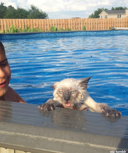공개된 사진에는 물에 빠진 고양이가 수영장 난간을 붙잡고 눈을 치켜 뜬 채 마치 분노한 듯한 표정으로 카메라를 노려보고 있다.