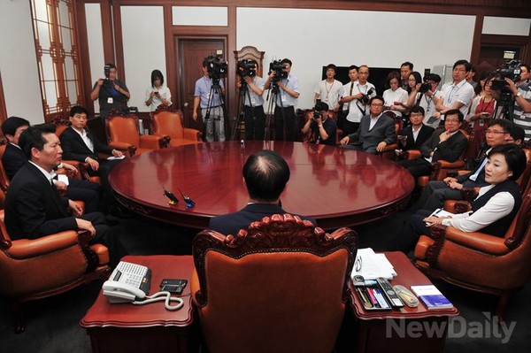 <강창희> 국회의장이 26일 오전 서울 여의도 국회의장실을 방문한 국조특위 야당의원들과 대화를 나누고 있다.