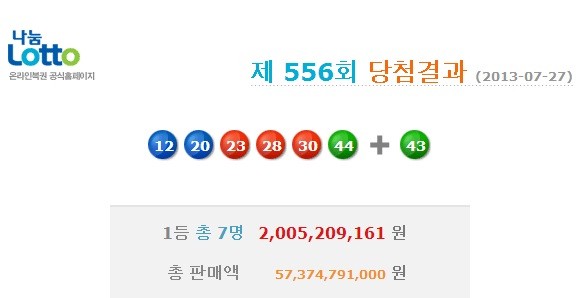 2013년 7월 27일 실시된 제556회 나눔로또 1등 당첨번호는 ‘12, 20, 23, 28, 30, 44’이며, 2등 보너스 번호는 43번이다.