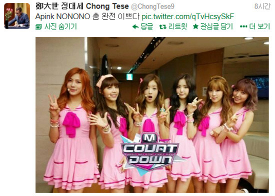 축구선수 정대세(수원 삼성 블루윙즈)가 걸그룹 에이핑크앓이에 빠졌다.정대세는 28일 자신의 트위터에 “에이핑크 ‘노노노’ 춤 완전 예쁘다”라는 글과 함께 에이핑크가 출연한 음악방송의 한 장면을 캡처한 사진을 게재했다.