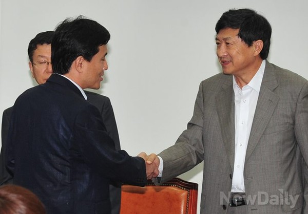[포토]악수 나누는 새누리당 '김진태' 의원과 '신기남' 위원장