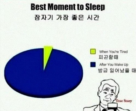 공개된 게시물에는 [잠자기 가장 좋은 시간]을 나타낸 원형 그래프가 담겨 있다. 그래프를 보면 90% 정도가 잠자기 가장 좋은 시간을 [방금 일어났을 때]로 표기했으며, 이에 [알람이 소용없는 이유]라는 제목을 붙였다.