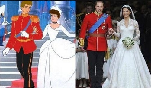 특히, 두 사진의 결혼식 모습이 매우 닮아 있어 눈길을 끈다. 애니메이션 속 왕자와 윌리엄 왕세손의 빨간 정복, 신데렐라 드레스와 케이트 미들턴의 드레스가 닮아 있어 보는 이들의 놀라움을 자아냈다.
