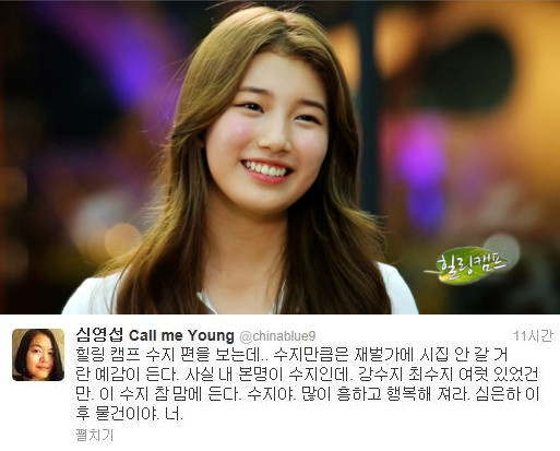 영화평론가 심영섭이 수지를 극찬했다.심영섭은 30일 자신의 트위터를 통해 “힐링캠프 수지 편을 보는데.. 수지만큼은 재벌가에 시집 안 갈 거란 예감이 든다. 사실 내 본명이 수지인데. 강수지 최수지 여럿 있었건만. 이 수지 참 맘에 든다. 수지야. 많이 흥하고 행복해 져라. 심은하 이후 물건이야. 너”라는 글을 올렸다.