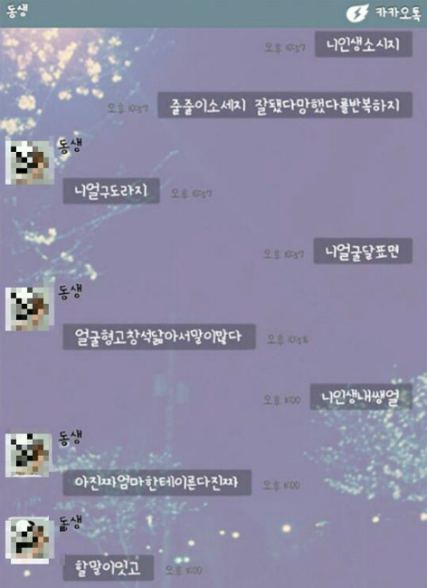 공개된 사진에는 누나와 남동생이 주고받은 대화가 담겨 있다. 누나는 동생에게 “니 인생 줄줄이 소시지. 잘 됐다 망했다를 반복하지”라고 말하자 동생은 “니 얼굴 도라지”라고 맞받아쳤다.