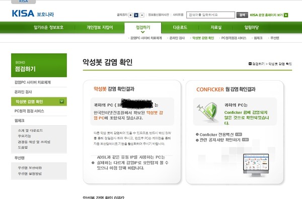 [악성 봇 감염확인]을 누르면 확인할 수 있다.확인 결과 악성봇 감염PC라는 진단이 나올 경우