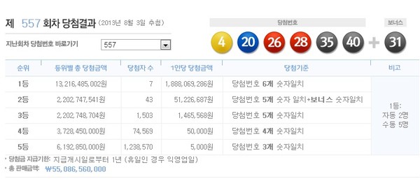 2013년 8월 3일 실시된 제557회 나눔로또 1등 당첨번호는 ‘4, 20, 26, 28, 35, 40’이며, 2등 보너스 번호는 31번이다.