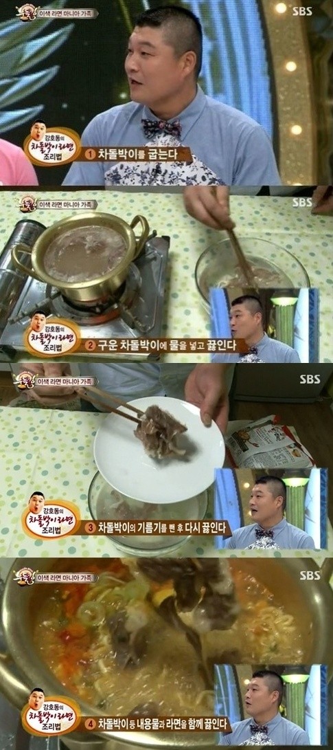이날 강호동은 자신만의 비법이 담긴 간편한 차돌박이 라면을 소개해 눈길을 끌었다. 강호동은 “우선 차돌박이를 먼저 굽고 구운 차돌박이에 물을 데쳐 기름기를 제거한다. 그 다음에 다시 라면에 넣고 함께 끓여준다”고 설명했다.