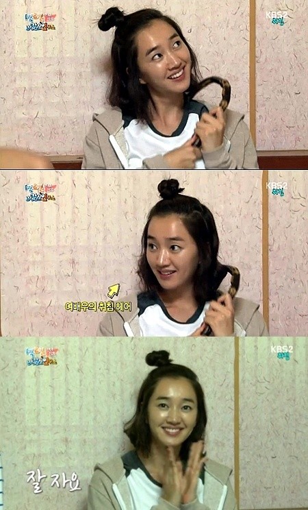배우 수애가 취침 전 귀여운 사과머리를 선보였다.지난 4일 방송된 KBS 2TV <해피선데이-1박2일>에서는 전남 장흥 비동마을에서 펼쳐진 [2013 바캉스 연구소] 두 번째 이야기가 그려졌다.
