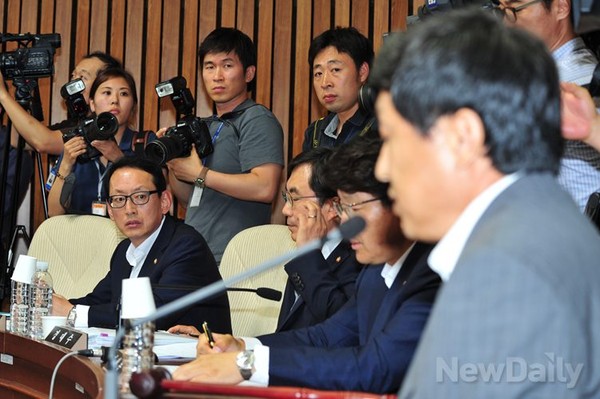 <신기남> 위원장이 5일 오후 여의도 국회에서 열린 [국정원 국조특위 기관보고]에서편파적 진행으로 새누리당 <김도읍> 의원에게 항의를 받고 있다.