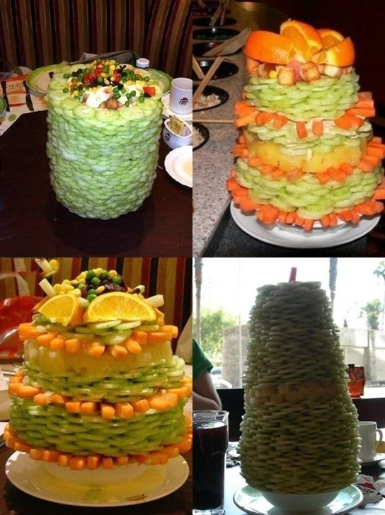 공개된 사진에는 하나의 접시에 탑처럼 층층이 쌓아올린 샐러드의 모습이 담겨 있다. 오이, 당근 등 야채를 이용해 기둥을 세우고 그 안에 과일과 요거트 등을 채워 넣었다.