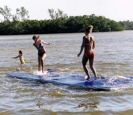 건장한 성인 10명이 올라타도 뒤집어지거나 가라앉지 않는 놀라운 위력을 발휘한다.당연히 이 <워터매트> 위에선