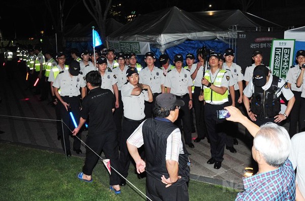 7일 새벽 서울시청 앞 광장에서 <대한민국어버이연합> 회원 50여 명이 [민주당 천막농성]을 비난하며,이들과 똑같은 천막을 지으려 했다.하지만 [민주 경찰]이 천막을 철거하고 회원들을 가로 막는 바람에천막 설치는 실패했다.