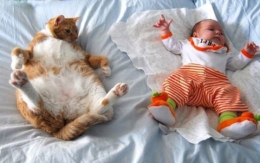 공개된 사진에는 침대에 누워 대(大)자로 자고 있는 아기의 포즈를 똑같이 따라하고 있는 고양이의 모습이 담겨 있다.