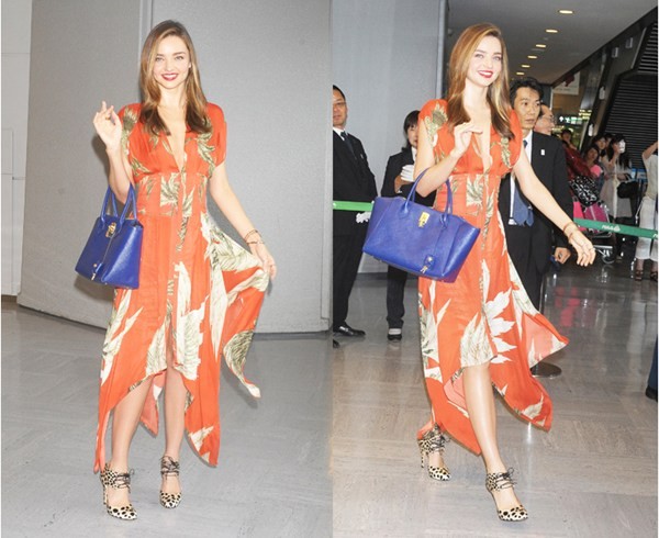 미란다 커가 원피스와 함께 매치한 블루 컬러 백은