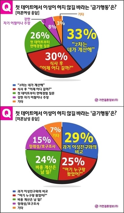 반면 남성들은 과거 이성친구와의 비교(29%)가 1위를 차지했다. 이어 첫 데이트 때부터 과거 캐묻기(25%), 계산은 전부 미루고 모른 체 하기(24%), 장래성·호구조사(14%) 등의 순이었다.