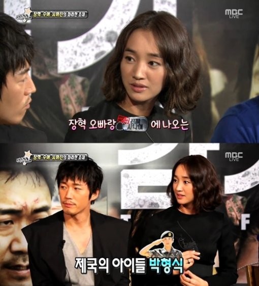 이날 수애는 “요즘 눈여겨보고 있는 아이돌이 있느냐”라는 질문에 “장혁과 함께 <진짜 사나이>에 나오는 박형식 군이 눈에 띈다”고 답했다.