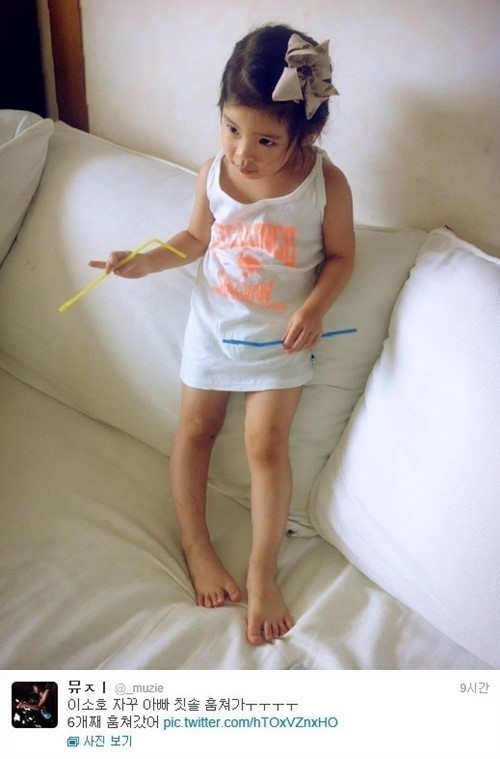 공개된 사진에는 뮤지의 딸 이소호 양이 빨대를 양손에 들고 소파 위에 올라가 있는 모습이 담겨 있다. 특히, 소호 양은 머리에 큰 핀을 꽂고 깜찍한 매력을 뽐내고 있으며, 아빠와 닮은 붕어빵 외모가 눈길을 끈다.
