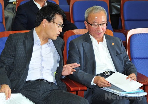 <현오석> 경제부총리 겸 기재부 장관이13일 오후 여의도 국회를 방문,새누리당 정책의원총회에 참석해 <윤상현>의원과대화를 나누고 있다.