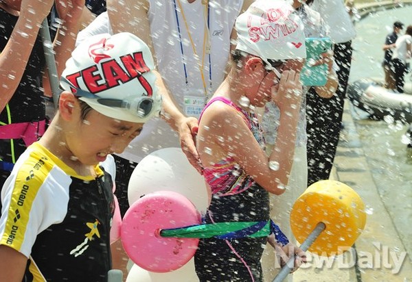 [포토]아이 차가워! 시작 전 시원한 한강물로 몸 적시는 어린이(어린이 한강헤엄쳐건너기)